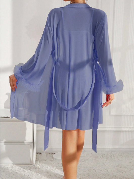 2pcs Set: Fishbone Style Cinch Waist Lace Cami Nightgown & Wide Sleeve Mesh Robe (Mauve Purple)