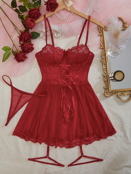 Sexy Lace See-Through Halter Dress, Thong Trouser Leg Covers, Seductive Underwear, Slimming Female Romantic Pajamas Red